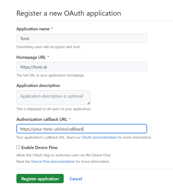 3. For **Authorization callback URL**, enter `https://your-tonic-url/sso/callback`.\