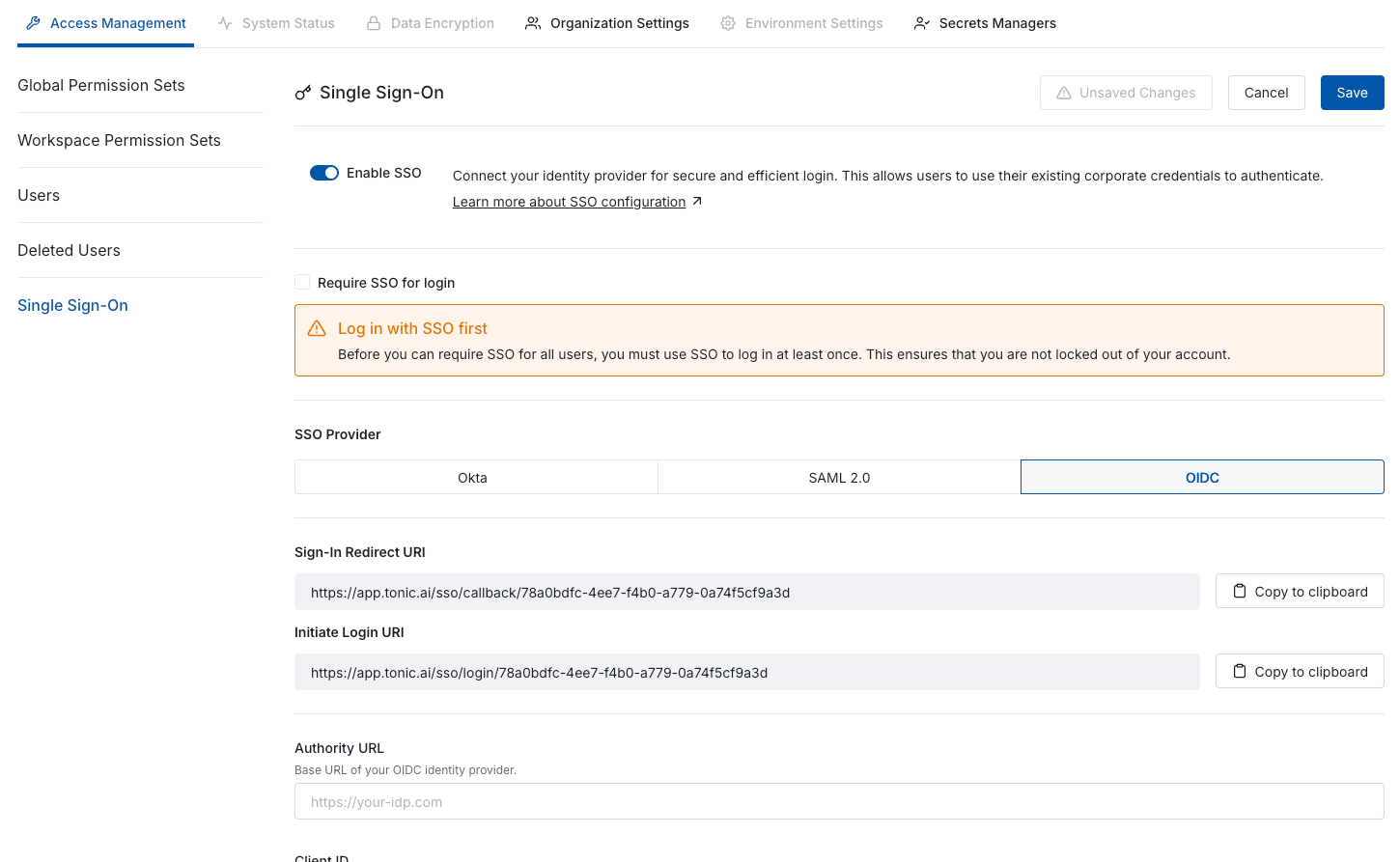 * [OIDC configuration](https://docs.tonic.ai/app/admin/tonic-user-access/oidc#sso-oidc-sso-setup)