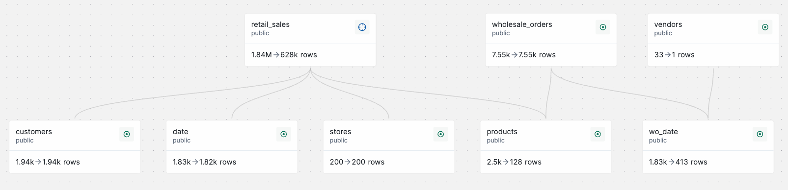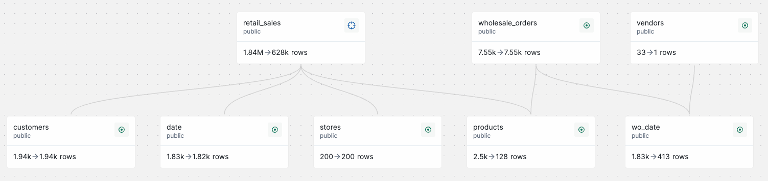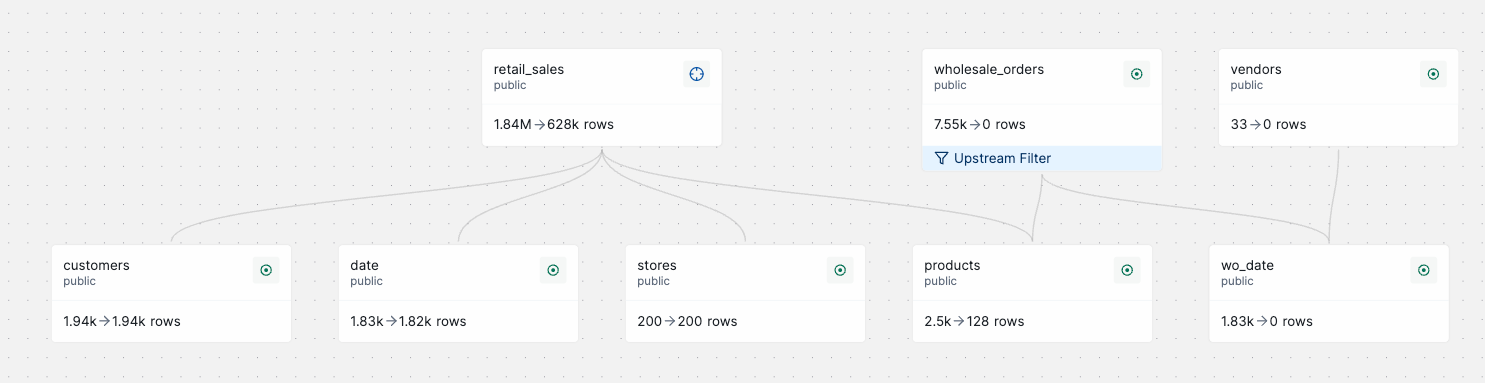 For example, in this subsetting graph, before you add an upstream filter to the `wholesale_orders` table, the subset includes records from `wholesale_orders`, `vendors`, and `wo_date`.