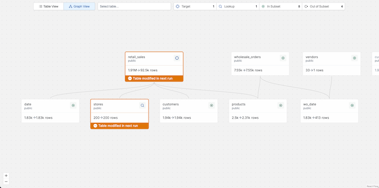 * **Table View** and **Graph View**. Both views display the source data tables, show the current subsetting configuration, and allow you to update the configuration.\