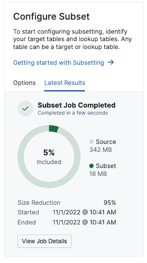The **Latest Results** tab displays details for the most recent data generation with subsetting. It ignores data generation runs that do not use subsetting.