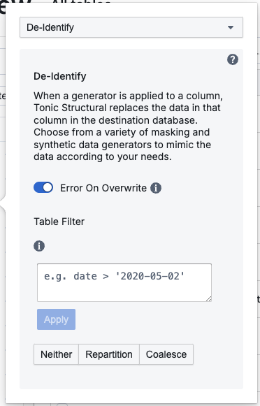 For Spark-based data connectors ([Databricks](https://docs.tonic.ai/app/setting-up-your-database/databricks), [Spark SDK](https://docs.tonic.ai/app/setting-up-your-database/spark-sdk)), the table is ignored completely.
