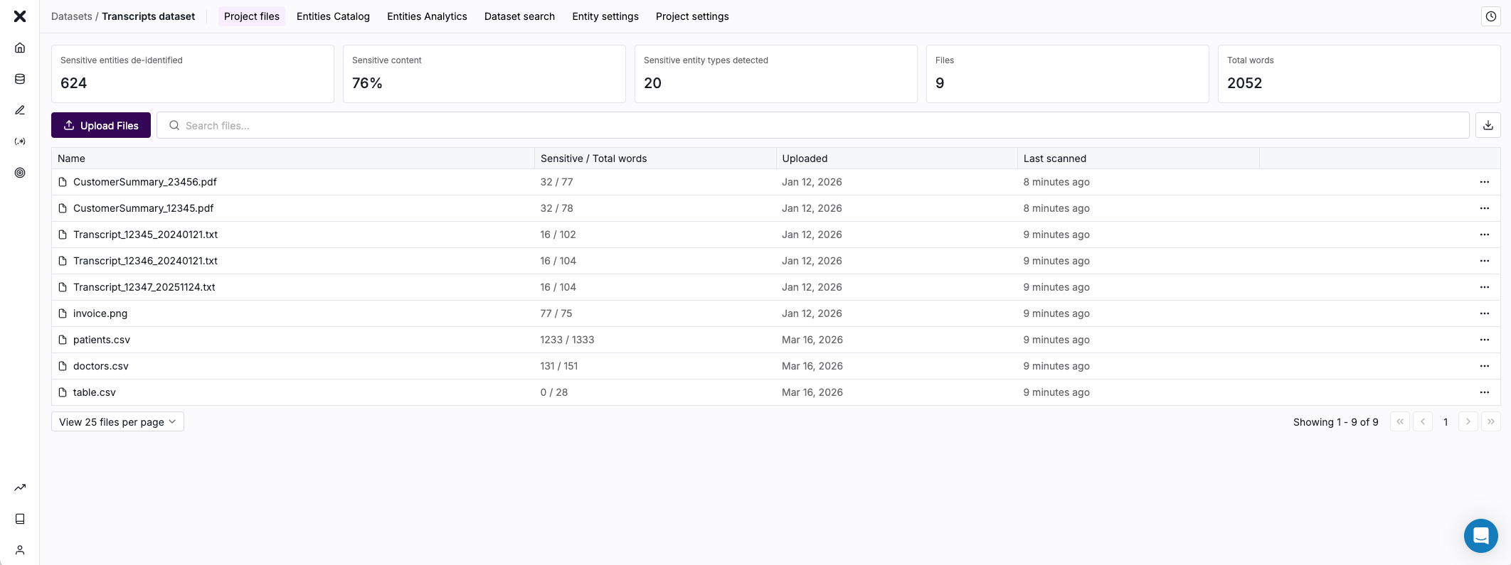 Provides information about the detected entity values in the dataset. Catalog displays the list of detected entity values. Analytics summarizes the count of values by entity type. Dataset search allows you to search for a word or phrase, to determine whether it was detected.