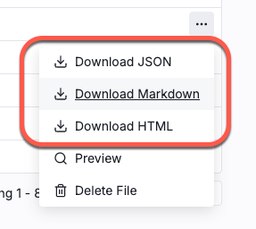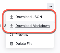 For datasets that generate JSON output, you can download either the JSON output or the redacted version of the Markdown content.